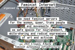 One of the ways in which this technopolitical becoming materializes is through the practices of feminist servers such as Systerserver, which is the feminist server that channels some of our more current technofeminist practices. Systerserver is one of the oldest feminist servers, founded in 2005 in the context of the Gender Changer Academy and the Ecelectic Tech Carnival. (more on that?) As part of Systerserver we are well connected and co-dependent on other feminist server projects (anarchaserver, Maadix, leverburns, digiticalcare...) and autonomous tech collectives. Together we have a need to share ways of doing, tools & strategies ''to overcome/overthrow the monocultural, centralized oligopolic surveillance & technologies of control.'' We need to resist the matrix of domination. Stop the techno-facilitated exploitation and continuation of social and climatological injustice(s).[[File:Feminist internet.jpg|thumb]] | |||
